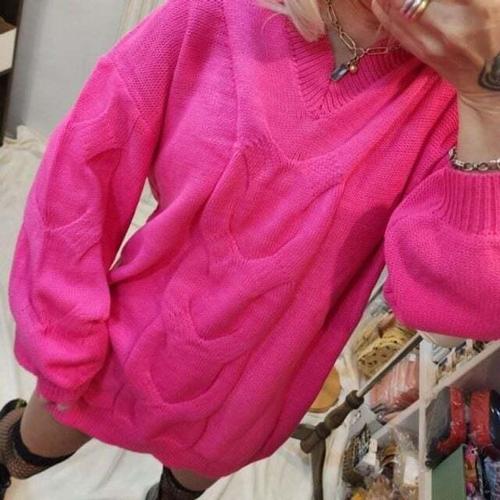 [셀럽하우스]루즈핏 XRFK8166 방한 겨울 스타일 핫 핑크 롱 니트 브이넥