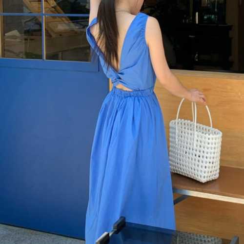 여성 세련된 쉬폰 원피스 홀터넥 브이넥 드레스 하늘하늘 트임 백 해변 바캉스 DUCHI1