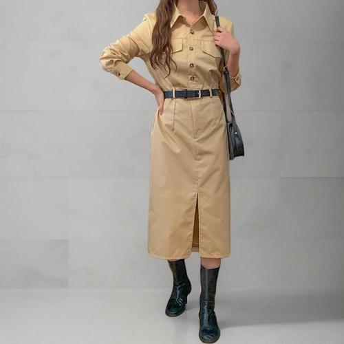 [다잇템]여성 베이직 혁대 카라넥 주머니 롱 드레스