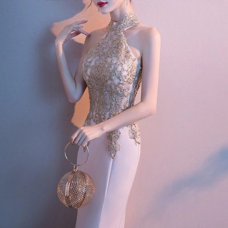 우아한 롱 이브닝 드레스 여성 호스티스 넥 행잉 뉴 2025 슬림 피쉬테일 볼 드레스 포멀 웨어 미드 웨이스트 디자인