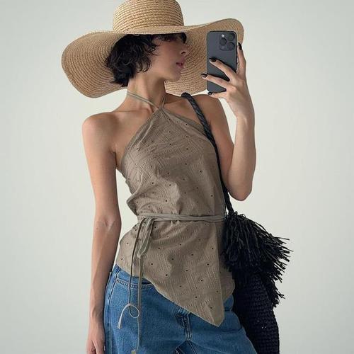 [신상오픈런]여성 홀터넥 펀칭 보헤미안 스트랩 비대칭 여름 나시 (36837422)