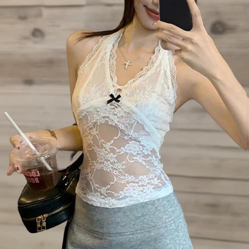 [신상오픈런]여성용 화이트 시스루 레이스 홀터넥 나시 (33650179)