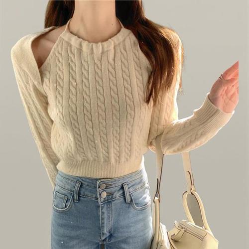 [신상오픈런]여성 홀터넥 꽈배기 디자인 슬림 크롭 긴팔 니트 (35333601)
