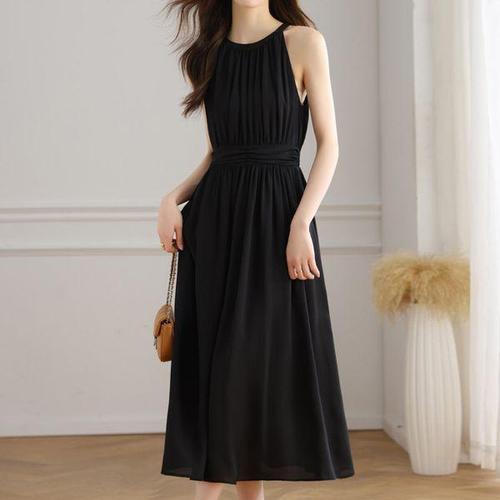 백리스 이너 슬림 홀터넥 스판 머메이드 롱 원피스