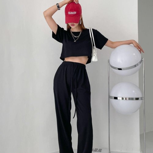 [옷자락] 여자 슬림 크롭티 부츠컷 롱팬츠 플리츠 여름 세트