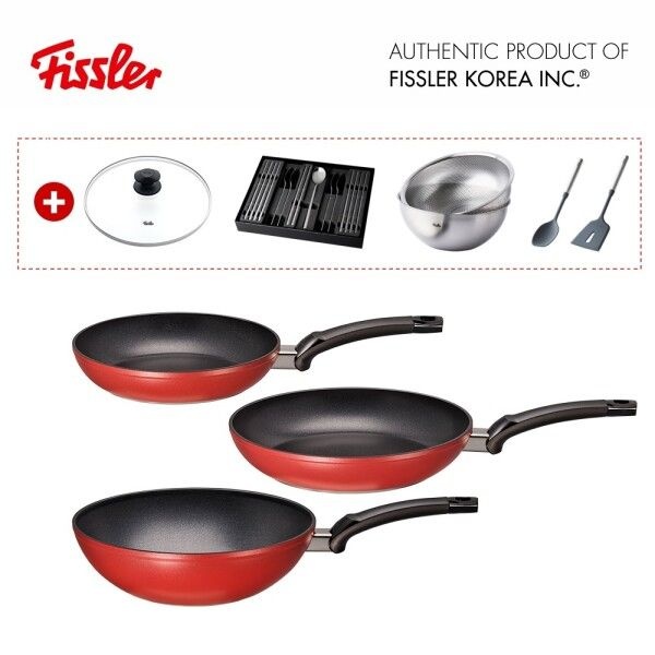 [휘슬러] 레비탈 플러스 레드 3종 + 28cm 유리뚜껑 + 커트러리 5인조+ 채반&믹싱볼 2종 + 실리콘 조리도구 2종