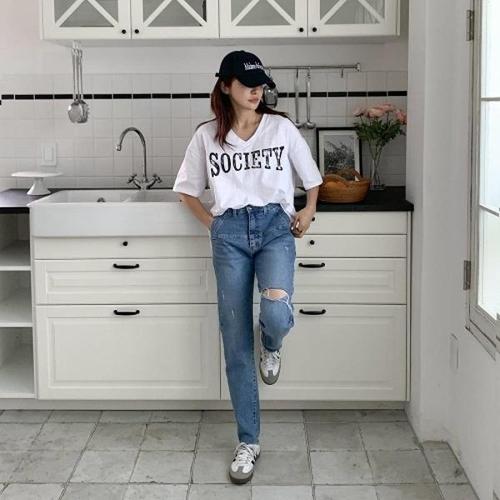 [다잇템]여자 여유핏 필기체 면원단 U넥 캐쥬얼 반팔티