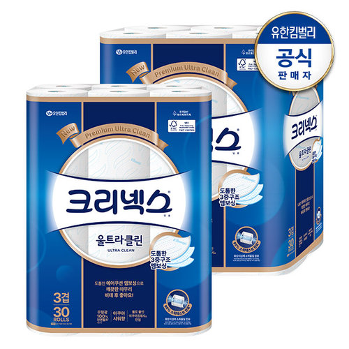 [유한킴벌리] 크리넥스 천연3겹 울트라클린 화장지 27m-30롤x2팩