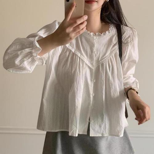 [신상오픈런]여성용 화이트 프릴 레이스 긴팔 플레어 블라우스 (40953113)