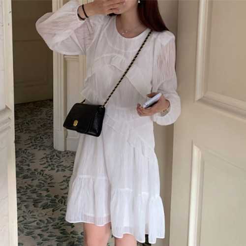 플레어 원피스 캉캉 소매끝 화이트 사이드 어깨셔링 롱 밴딩 프릴 뒷지퍼 스트링 라운드넥