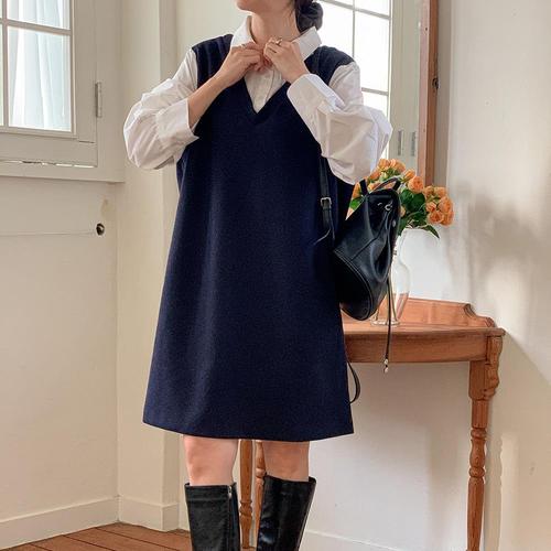 [옷자락]여자 하객룩 레이어드 흰셔츠 브이넥 박시 미디 원피스