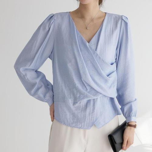 [신상오픈런]랩블라우스 브이넥 드레이퍼리 긴팔 비서 면접 흰셔츠 (30551466)