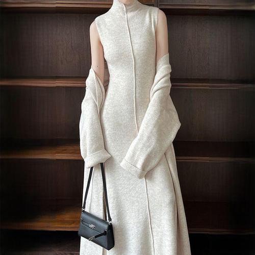 정상가:119,000원 ㅣ 베이직 후드 니트 롱 H라인 투피스 셋업 (WIADOP021)