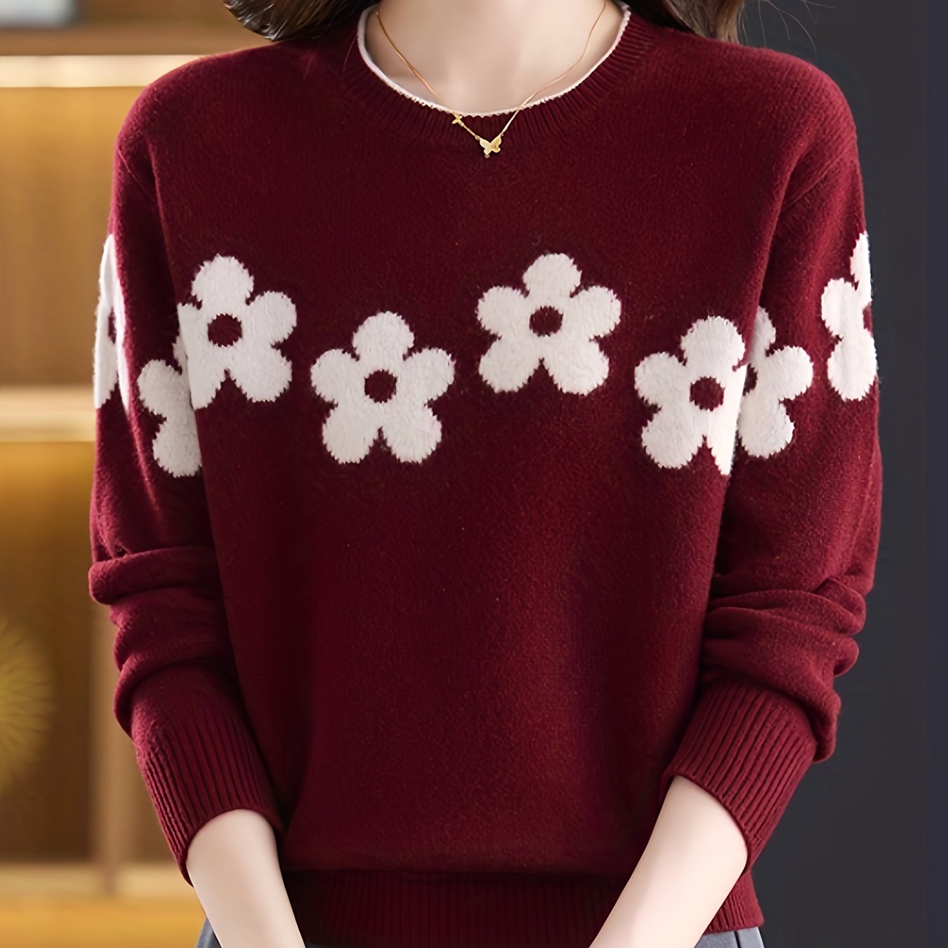 TEMU 여성용 포근한 두꺼운 스웨터 - 긴소매 라운드넥 플로럴 패턴 풀오버, 부드럽고 따뜻한 가을/겨울용 원단, 캐주얼 데일리 & 포멀룩 - 여성 스웨터, 겨울용 스웨터, 겨울 의류, 클래식 니트, 스타일리시 니트