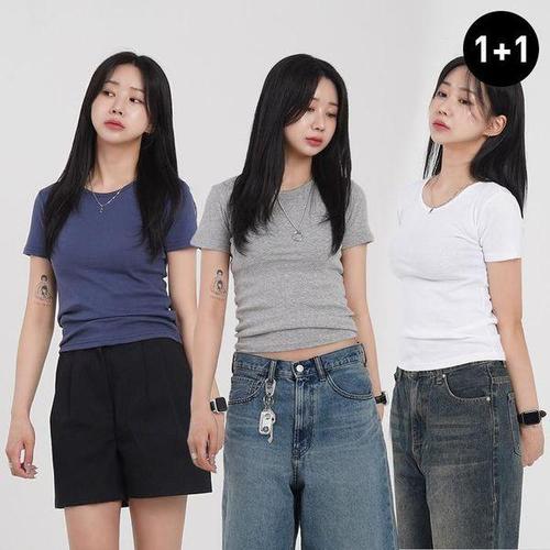 [화이트빌딩]1+1 여자 라운드넥 반팔 기본 반팔티셔츠 무지 이너