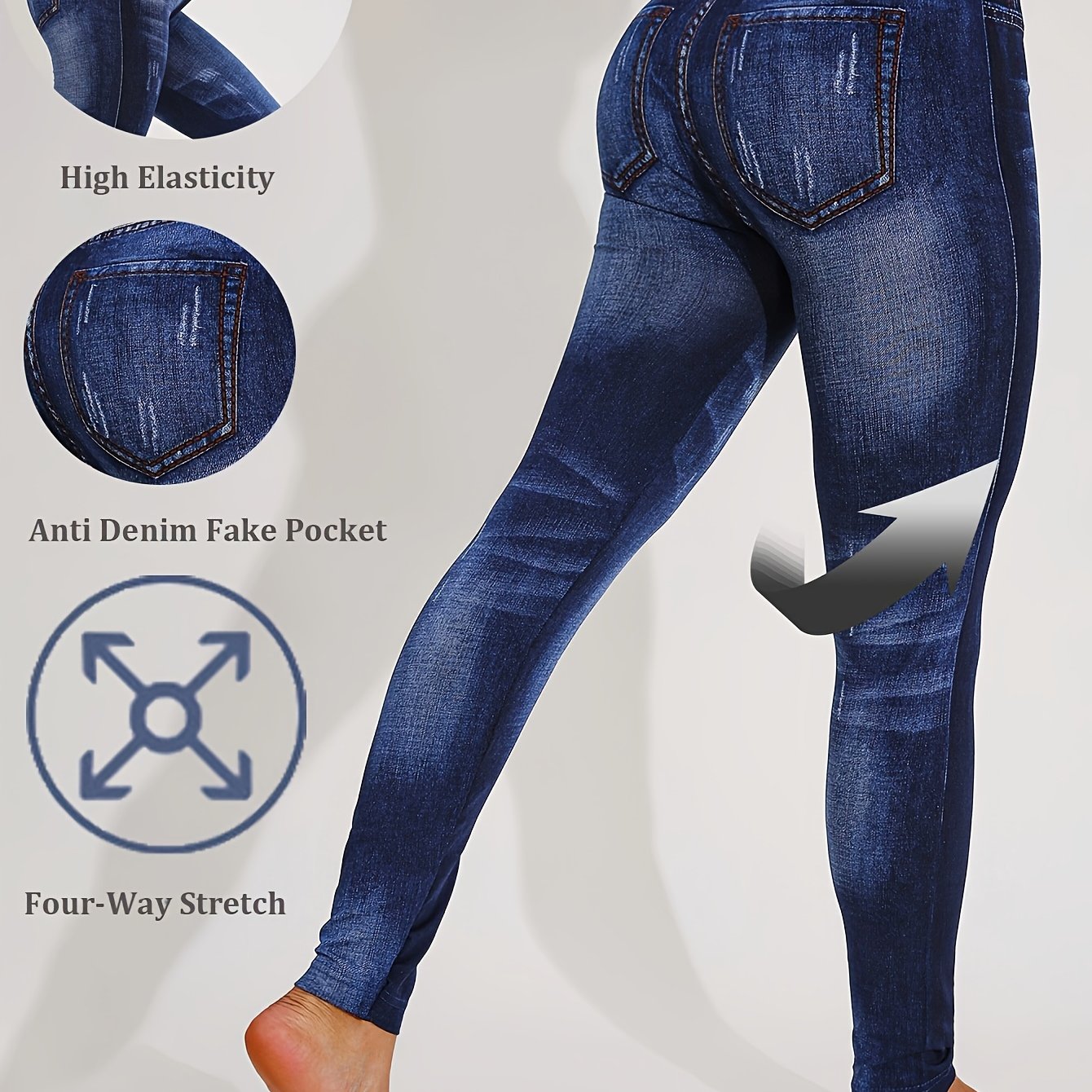 TEMU 【모사 데님】가을과 겨울 방향성 스타일, 패션과 우아한 여성용 데님 프린트 레깅스, 캐주얼 데님 스키니 팬츠, 완벽한, 세 자루 길이, 높은 탄성, 통기성 단색 팬츠, 슬림핏 긴 바지.