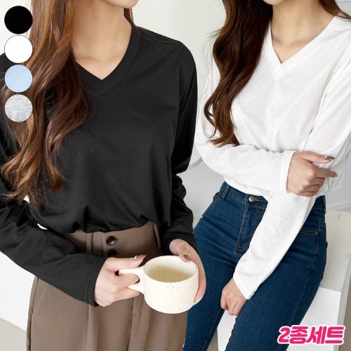[2종세트] 가비진 여성용 쫀쫀 스판 베이직 무지 브이넥 긴팔 티셔츠
