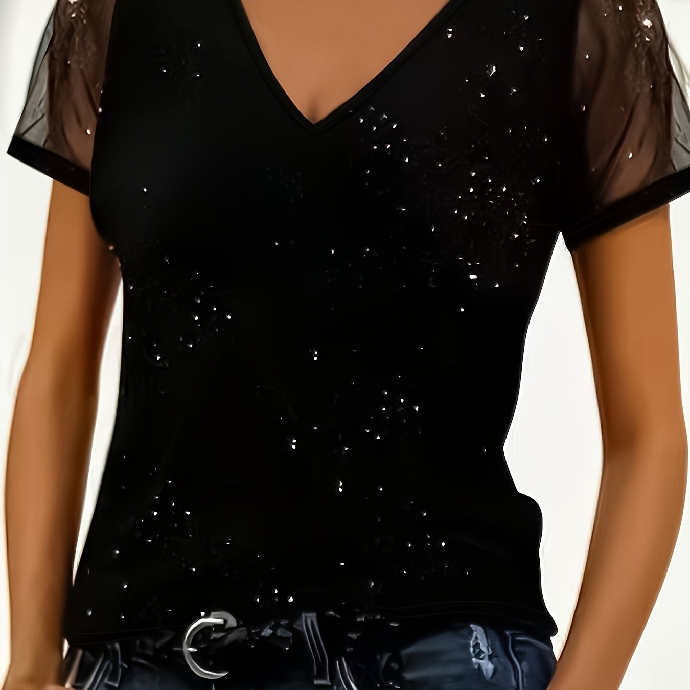 TEMU 2026년 신상 여성 패션 우아한 캐주얼 티셔츠 - 블랙 & 화이트 별 점 V넥 반팔 상의, 목선과 섹시한 가슴뼈 메쉬 소매 슬림핏, 가는 팔을 강조하는 반투명, 섬세한 별빛 하늘 분위기, 여성스럽고 부드러운 스타일
