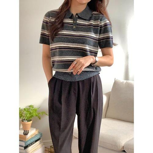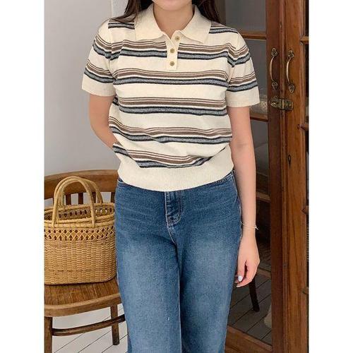 [다잇템]여자 카라넥반팔 줄무늬 SS 페미닌 골지 니트_3