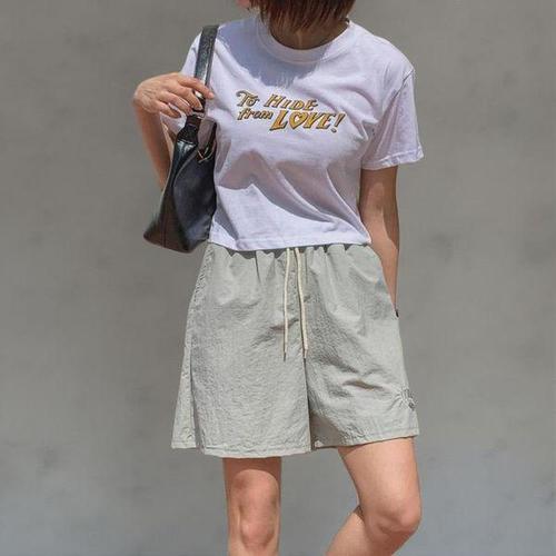 [옷자락]여성 키치무드 자수 문구 바스락 4부 밴딩 숏팬츠