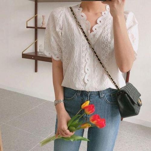 [셀러허브_여성트랜드패션]여자 블라우스 셔츠 여름 펀칭 5부 V넥 벌룬 반팔