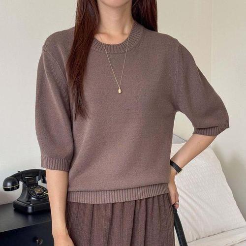[옷자락]여성 라운드넥 니트 5부 반팔 데일리웨어 플레인 가을 니트