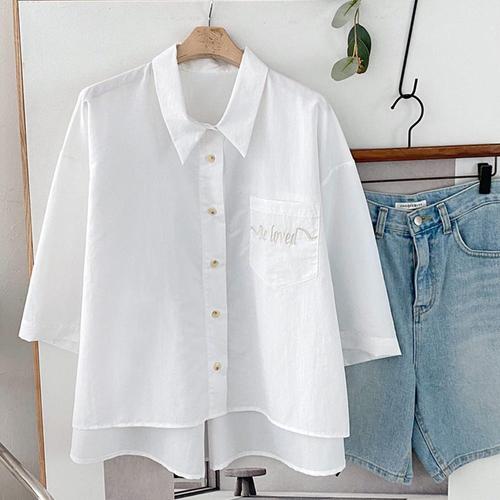 여성 카라넥 스티치 5부 루즈핏 언발 여름 블라우스 DGB-WBL-4464-아이보리