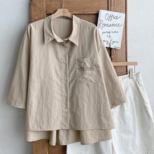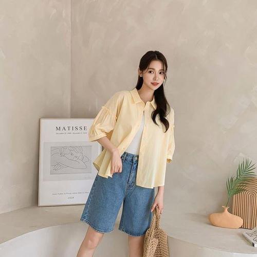 [옷자락]여자 면혼방 루즈핏 소매 프릴 5부소매 남방