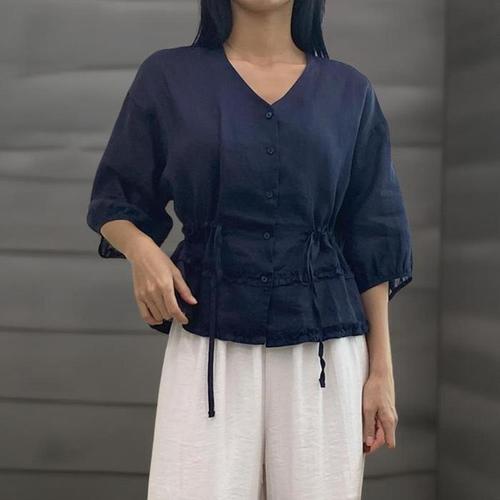 [신상오픈런]여성용 브이넥 린넨 7부 프릴 블라우스 클래식 스타일 (35834883)