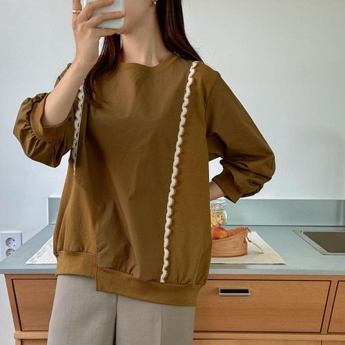 [옷자락] 여성 셔링 칠부티 레이스 컷팅 절개 가을 면 티셔츠