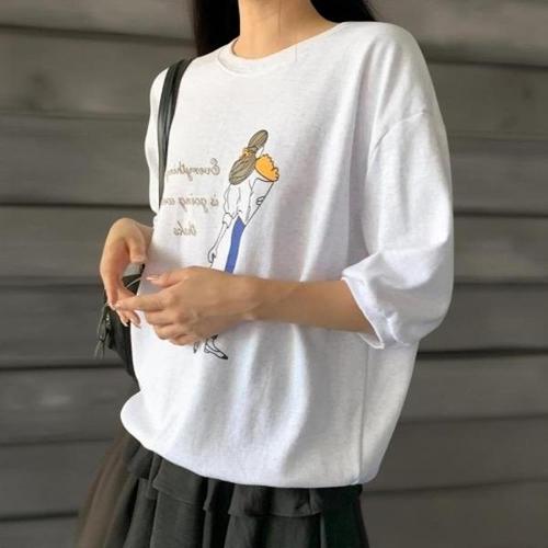 유니픽 여성 봄가을 순면 라운드넥 7부 소매 티셔츠 편안한 루즈핏zdy