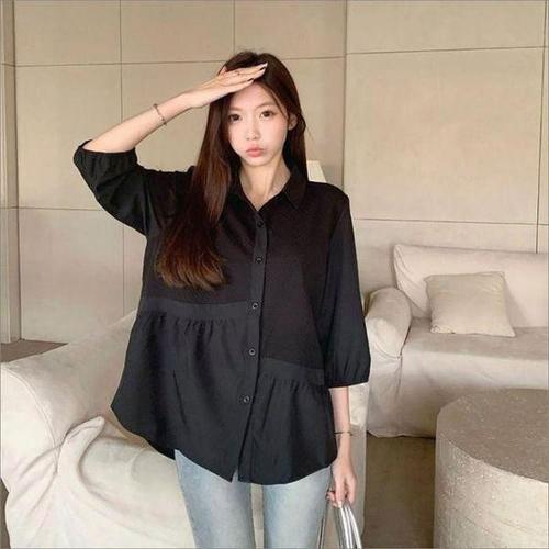 [셀러허브_여성트랜드패션]여자 2컬러 7부소매 블라우스 카라셔츠 루즈핏 언발