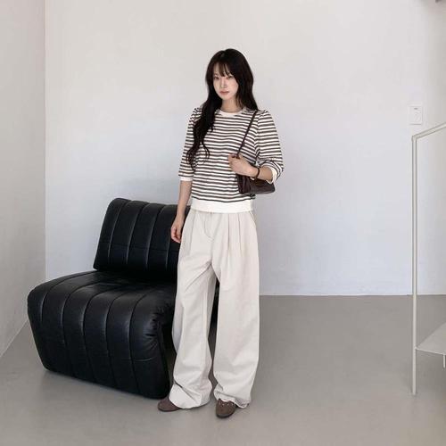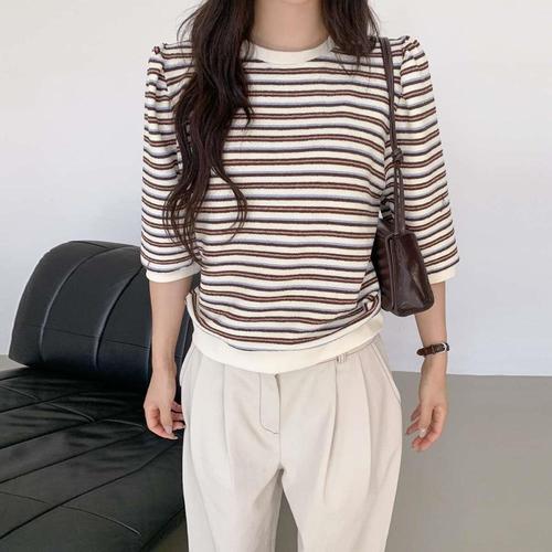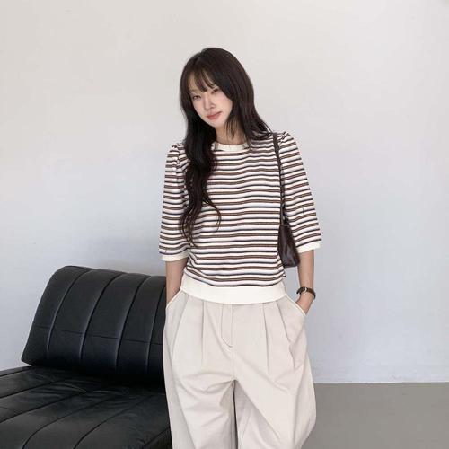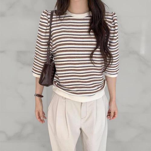 [옷자락]여성 키치 무드 배색 스트라이프 7부 소매 라운드넥 티셔츠