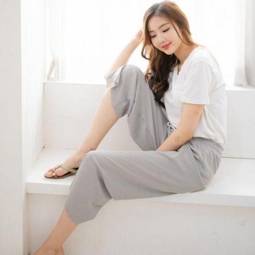 [에이치플러스몰]여름 린넨 스판바지 여성 9부 밴딩팬츠 통 바지