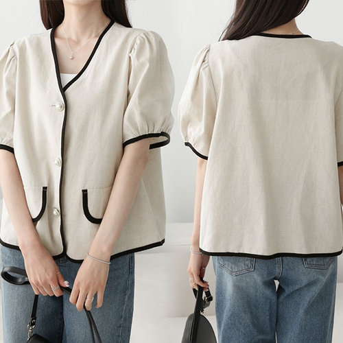 [마쟈]퍼프 볼륨소매 하프 더블 린넨 자켓