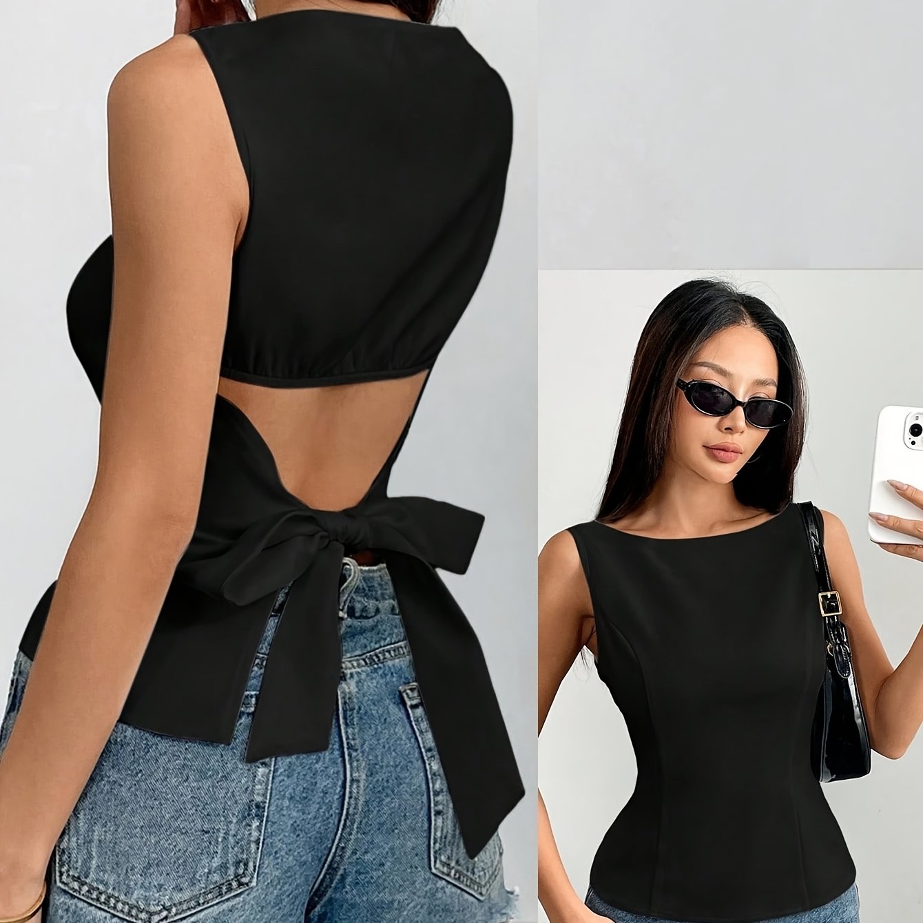 TEMU 우아한 백색 민소매 블라우스와 뒷면 리본 디테일 - 여성용 캐주얼하면서 섹시한 오피스웨어, 봄과 여름에 완벽한 시즌 패션 탑, 세련된 직물, 부드러운 원단 셔츠