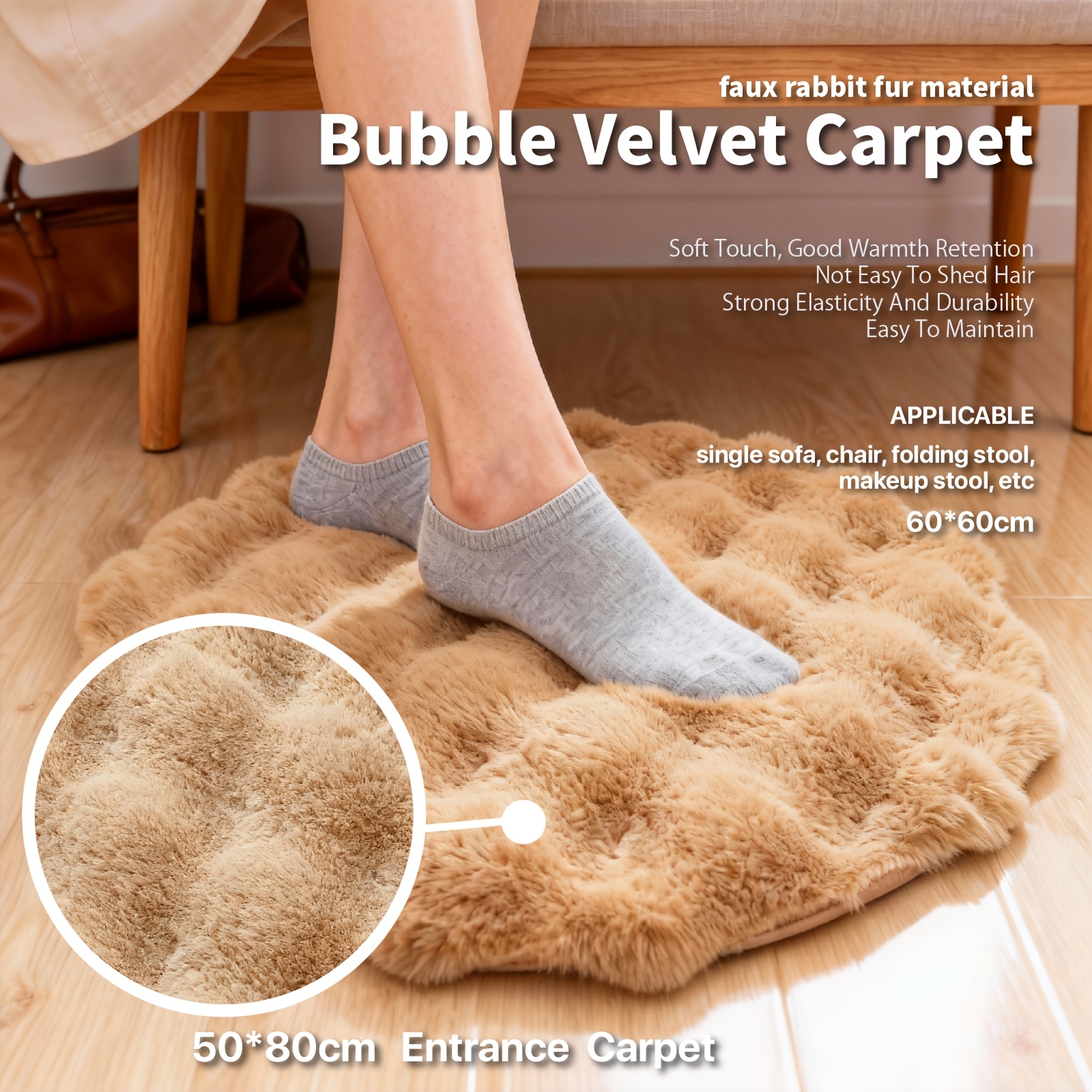 TEMU 고밀도 인조 토끼털 버블, 발을 내딛는 순간 부드럽게 감싸는 솜털 같은 질감. 다목적 쿠션: 침실이나 욕실의 아늑한 액센트로 활용 가능, 화장대 의자나 소파 코너의 편안한 좌석 패드로도 사용. 표준 직경 60cm, 세 가지 색상(핑크, 카멜) 제공, 다양한 코너에 유연하게 맞춰 집에 부드러운 따뜻함을 더합니다