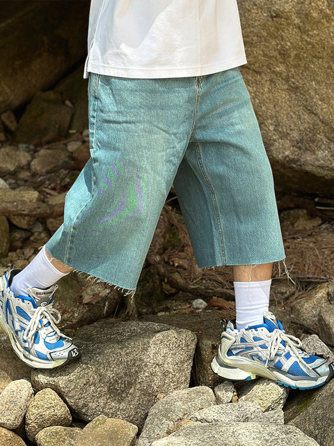 [클라코] 와이드 벌룬 캣 워싱 버뮤다 데님 팬츠