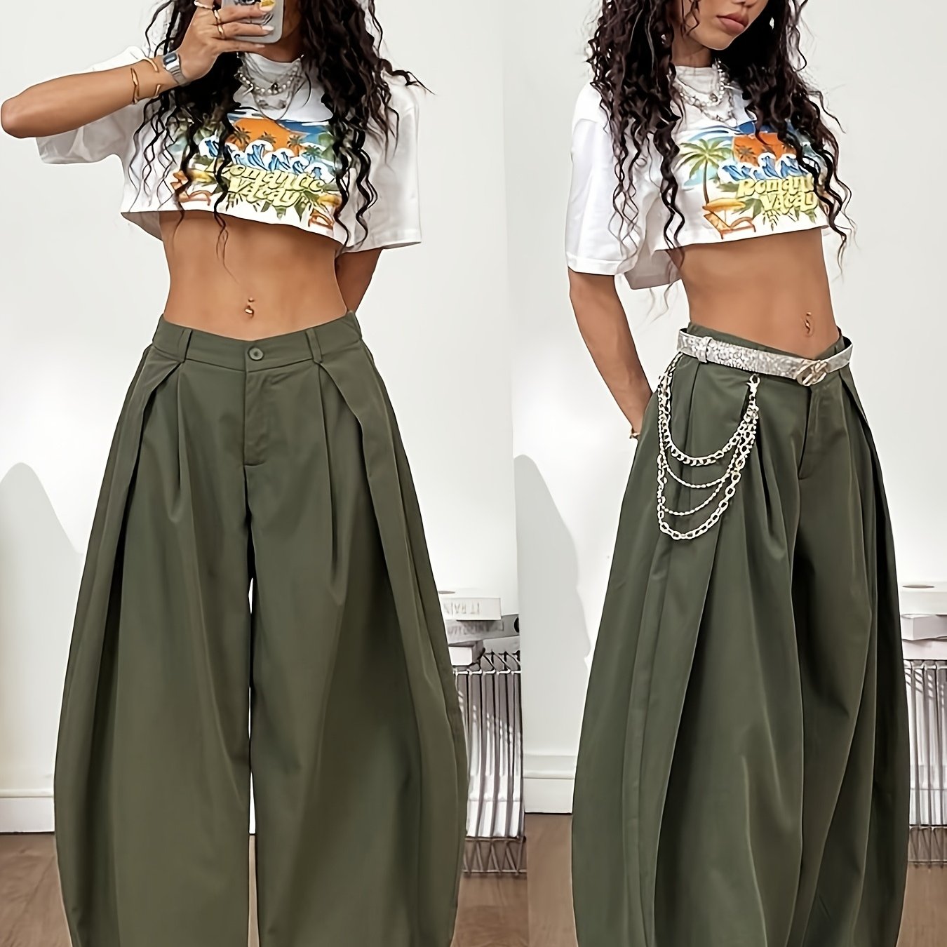 TEMU 여성용 우아한 프렌치 스타일 와이드 레그 팬츠 - 슬림핏 허리와 플레어드 레그, 카키 솔리드 컬러, 봄/가을 사이드 포켓, 캐주얼부터 포멀웨어까지 다재다능한 여성용 와이드 레그 트라우저, 트라우저, 여성용 바지