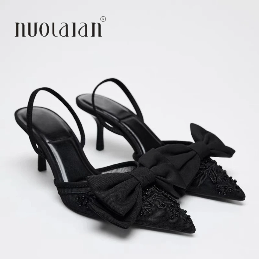 여성용 리본 포인티드 토 블랙 하이힐 펌프스 2025 패션 메쉬 패브릭 슬링백 여성 샌들 섹시 스틸레토 여성 신발