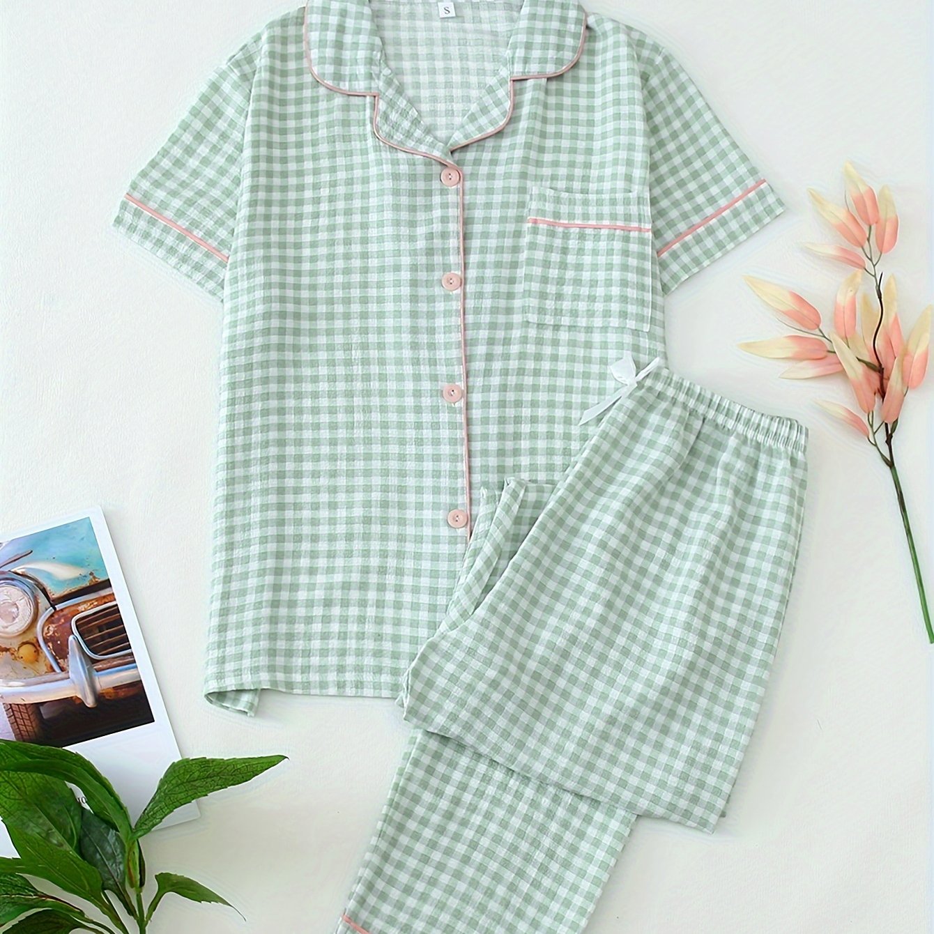 TEMU 여성용 컬러 블록 체크 캐주얼 세트. 반팔 버튼업 상의와 긴 바지로 구성되어 있으며, 라운지웨어 또는 잠옷으로 야외 활동에 적합합니다.