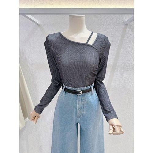 아이엠몽 여성용 슬림핏 헨리넥 랩 골지 긴소매 니트 티셔츠 R6S120