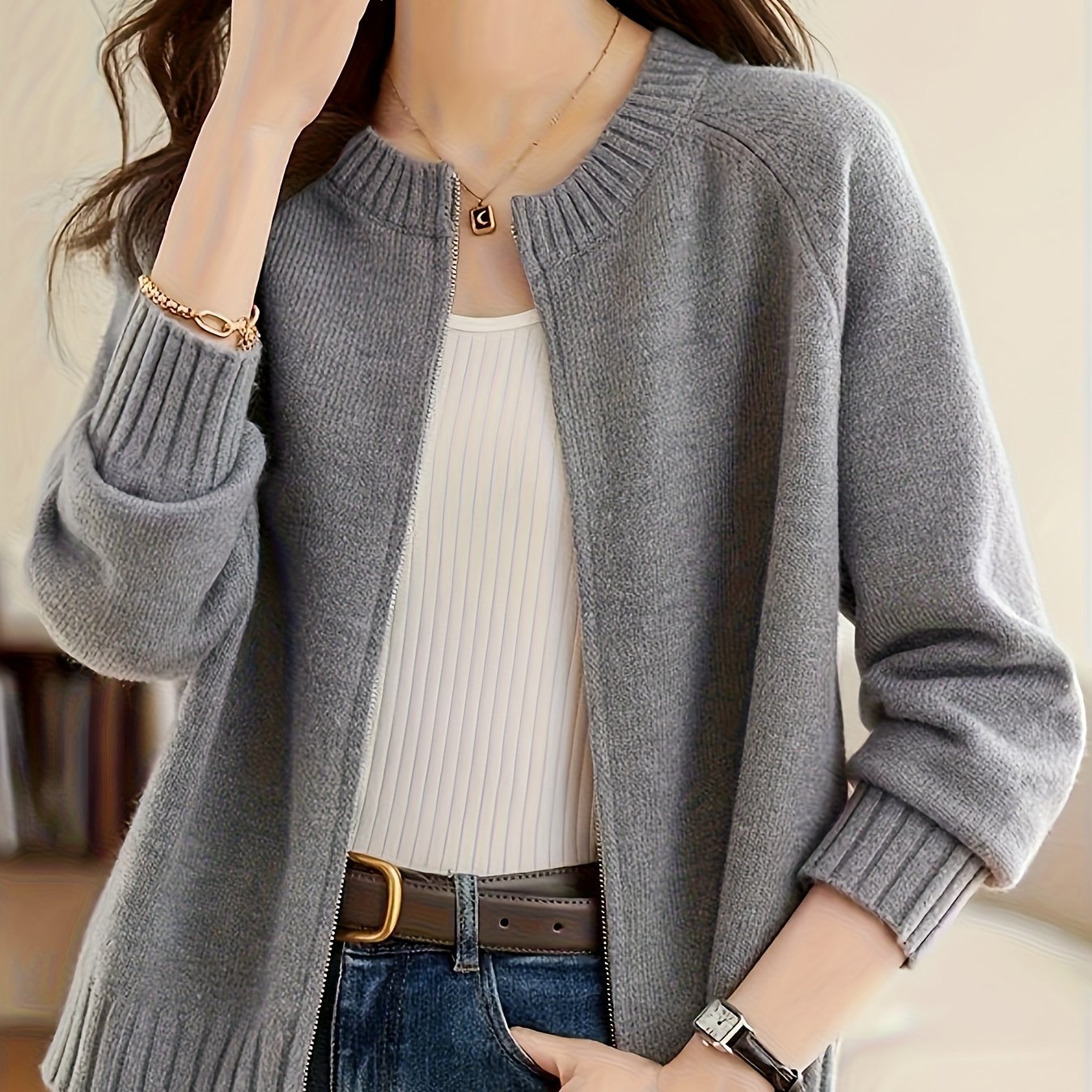 TEMU 여성용 탑, 뉴 가을/겨울 라운드넥 긴팔 가디건, 활용도 높은 단색 스웨터 코트