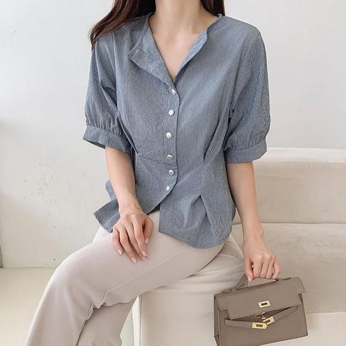 [신상오픈런]여성 여름 하객 패션 스트라이프 핀턱 A라인 반팔 티셔츠 (36847638)