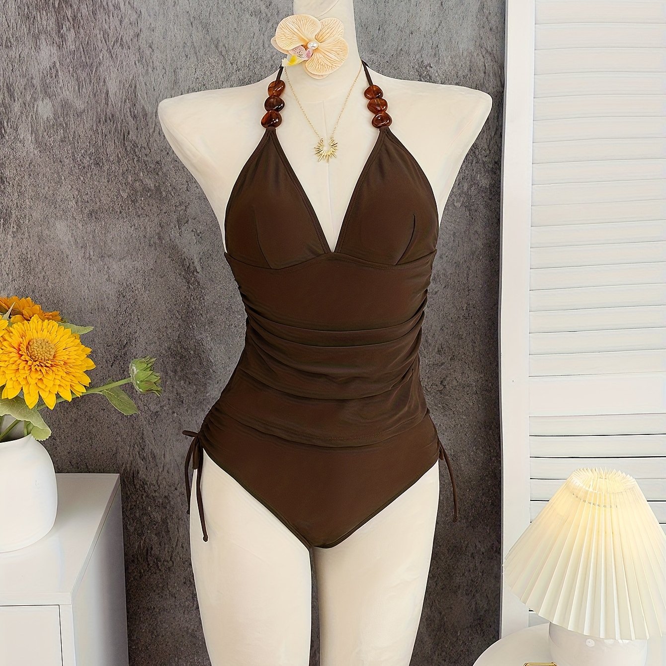 TEMU 여성용 솔리드 컬러 탱키니 세트, 대조 비즈 트림, 홀터넥 섹시 탱키니 수영복 - 수영 파티 및 해변 휴가용
