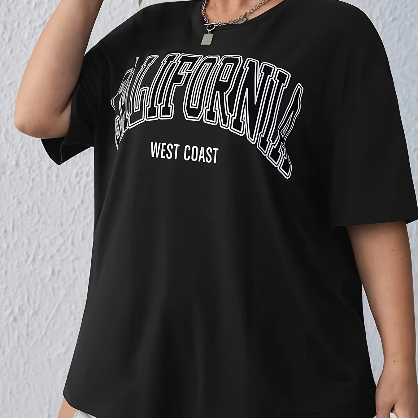 TEMU 캘리포니아 편지 프린트 루즈 캐주얼 반팔 상의, 라운드 넥 스포츠 티셔츠, 여성 액티브웨어 그래픽