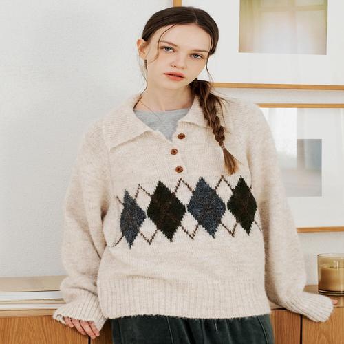 [비엔엑스]카라 하프 버튼 아가일 패턴 니트 (BX4KP041L0)