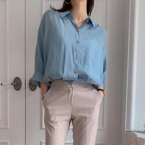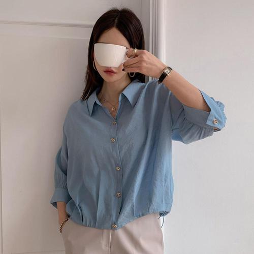 여성 카라넥 밑단스트링 시원한 7부소매 루즈핏 블라우스 셔츠 CAT-WBL-4353-소라