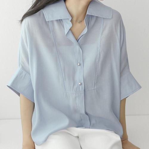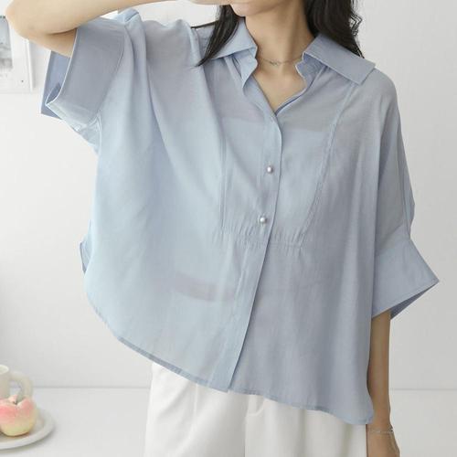 여성 카라넥 럭셔리 루즈핏 시스루 반팔 블라우스 CAT-WBL-4412-소라