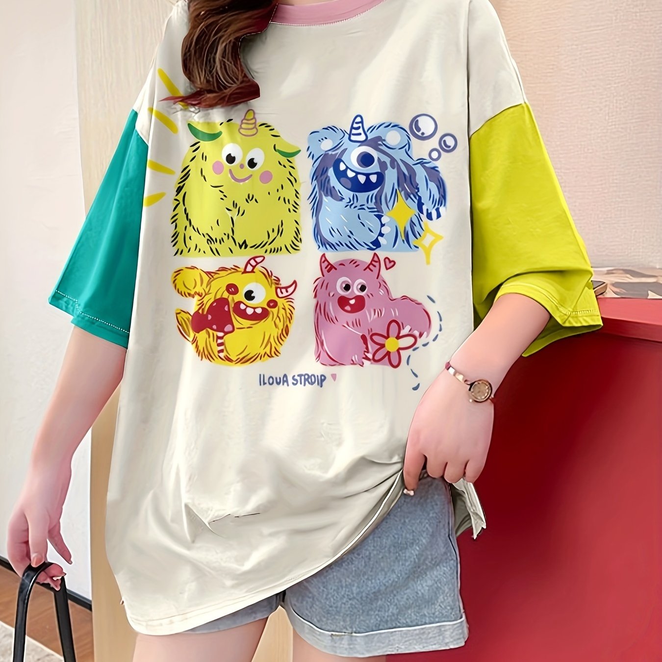 TEMU 여름 신상 대사이즈 루즈핏 패션 트렌드 슬림 캐릭터 프린트 라운드넥 여성용 미디엄 롱 슬리브 티셔츠